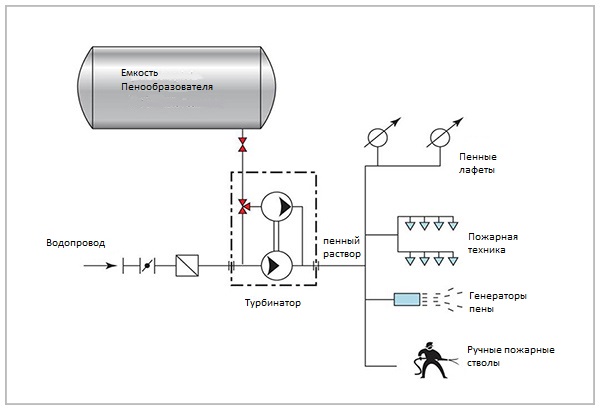 ТБД-ППТ - состоит из двух основных элементов, связанных между собой в одном корпусе, это водяной двигатель (турбина) и пенный насос, работающий от вращающейся турбины. Оба элемента размещены в одном корпусе турбодозатора.