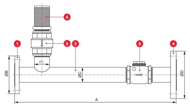 Принцип работы пеногенератора основан на образовании в диффузоре, находящегося внутри корпуса (поз. 2), пены низкой кратности, которая формируется при смешении потока раствора пенообразователя, поступающего под рабочим давлением через форсунку, встроенную во входной фланец (поз. 1). Далее в поток рабочего раствора пенообразователя эжектируется воздух, поступающий через фильтр грубой очистки (поз. 6). Получившаяся в результате воздушно-механическая пена выводится в линию через выходной фланец (поз. 4). Пеногенератор снабжен двумя обратными клапанами – воздушным (поз. 5) и пенным (поз. 3), срабатывающими при превышении давления со стороны резервуара. Детали генератора выполнены из материалов, стойких к коррозионному воздействию.