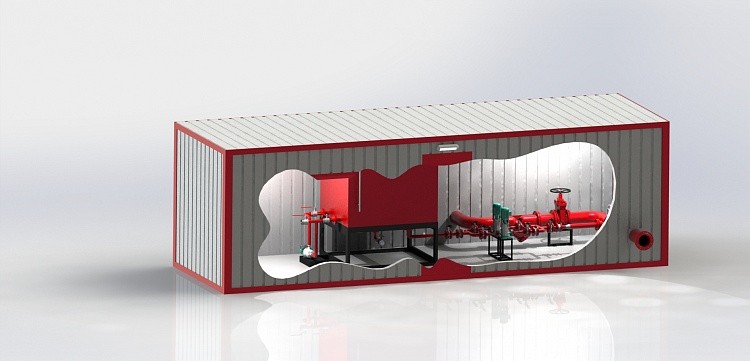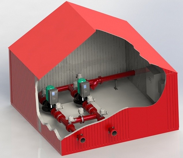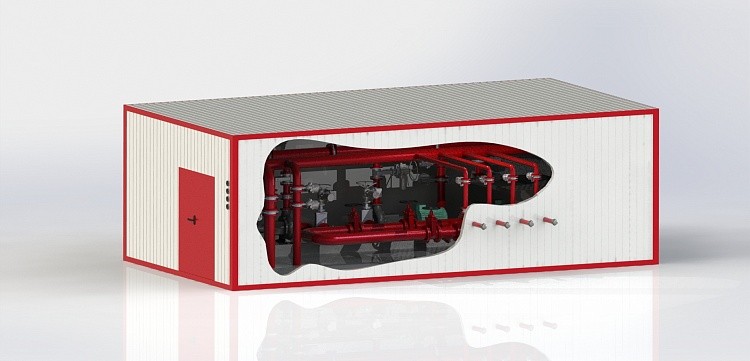 Сдвоенный блок-модуль пенного пожаротушения I, II или III степени огнестойкости в составе: здание 5х10 м, системы вентиляции, отопления, освещения. Насосная станция с расходом до 120 л/с, напором до 1,0 МПа – 1 шт.