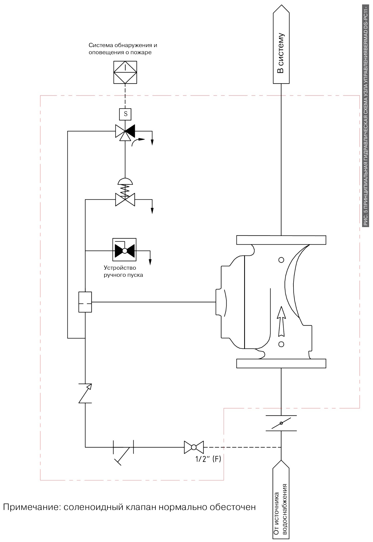 При поступлении управляющего сигнала на соленоидный клапан [6] он открывается, сбрасывая давление с камеры управления гидравлического пилотного клапана [2] и открывая его. Таким образом происходит отток воды из камеры управления [1] базового клапана – базовый клапан открывается, рабочая среда подается в питающий трубопровод, узел управления переходит в рабочий режим. налогичный сброс давления из камеры управления [1] базового клапана происходит при открытии крана ручного пуска [7].