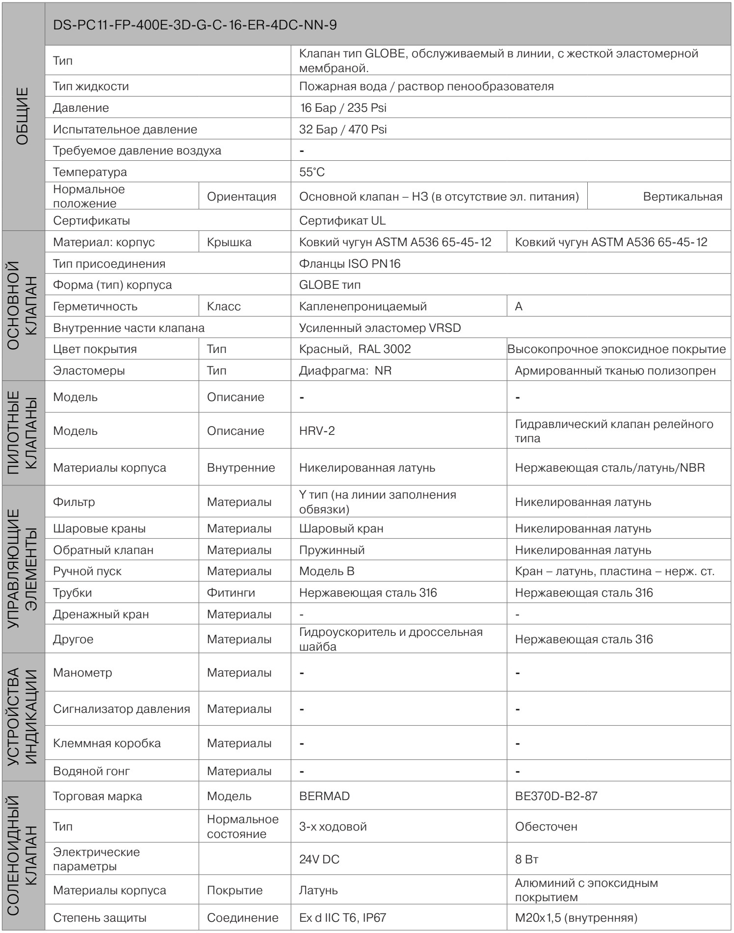 Спецификация на дренчерный узел управления BERMAD PC11-FP-400E-3D-G-C-16-ER-4DC-NN-9 (обозначение по ГОСТ Р 51052-2002: УУ-Д 40-300/2,8(Э12,24,220) В-УФ(М,Х).В4-"400E-3D-G-C-16-ER-4DC-NN-9") во взрывазащищенном исполнении