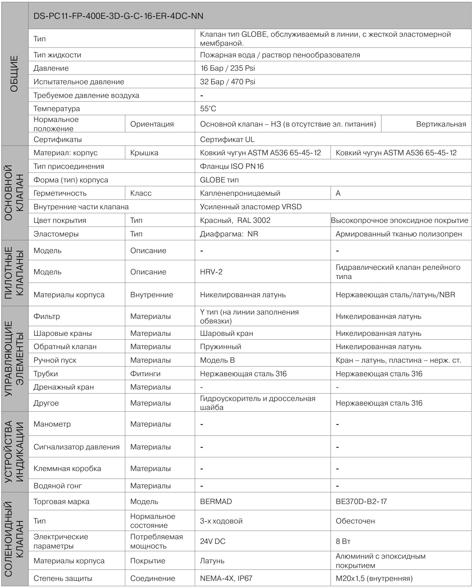 Спецификация на дренчерный узел управления BERMAD PC11-FP-400E-3D-GC-16-ER-4DC-NN (обозначение по ГОСТ Р 51052-2002: УУ-Д 40-300/2,8(Э12,24,220) В-УФ(М,Х).В4-"400E-3D-G-C-16-ER-4DC-NN") в общепромышленном исполнении