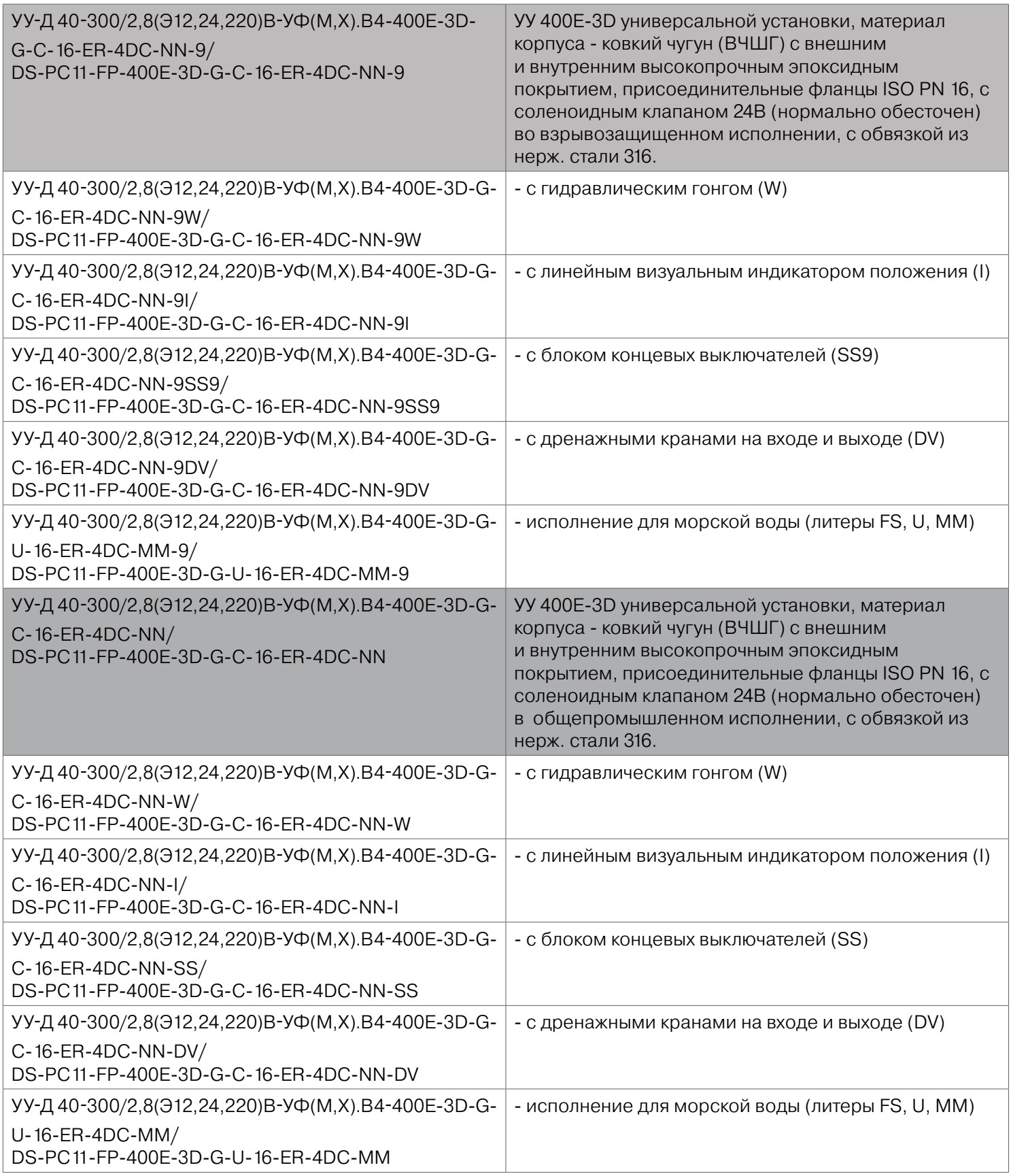 Ниже приведены примеры формы записи при заказе узла управления с самыми распространенными опциями. В случае, если необходимо заказать узел управления с нескольким опциями, в конце заказного кодаследует последовательно указать все символы, обозначающие данные опции.