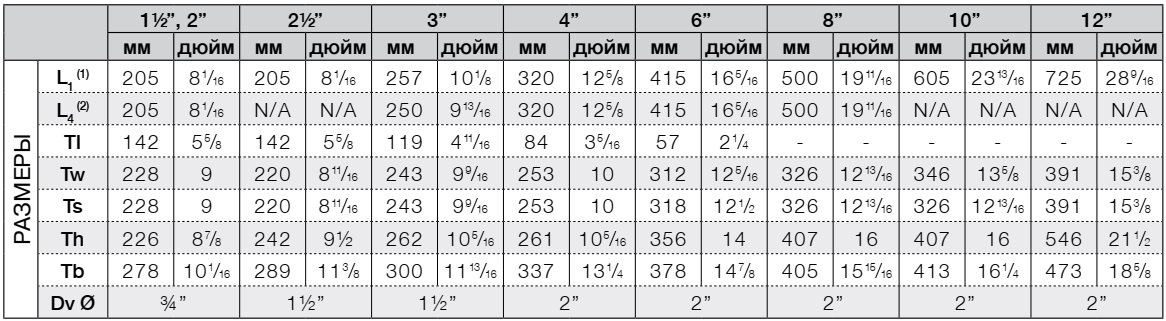Размеры, сертифицированные по UL - 1½, 2, 2½, 3, 4, 6, 8 & 10”