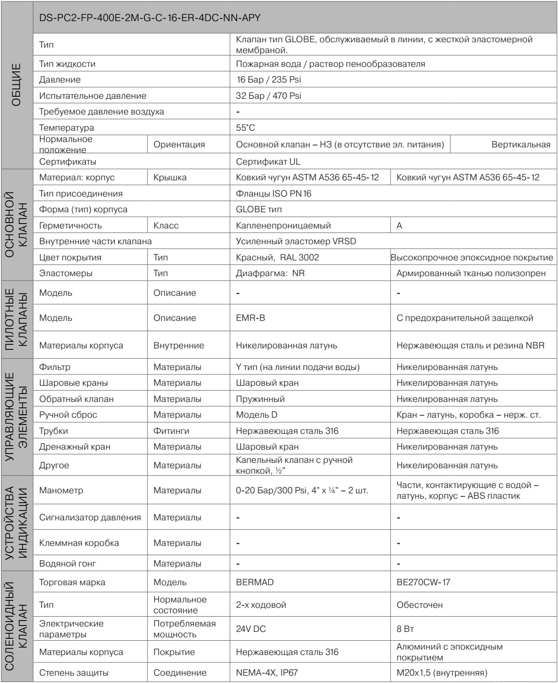Спецификация на дренчерный узел управления BERMAD PC1-FP-400E-2M-G-C-16-ER-4DC-NN-APY (обозначение по ГОСТ Р 51052-2002: УУ-Д 40-300/2,8(Э12,24,220) В-УФ(М,Х).В4-"400E-2M-G-C-16-ER-4DC-NN-APY") в общепромышленном исполнении