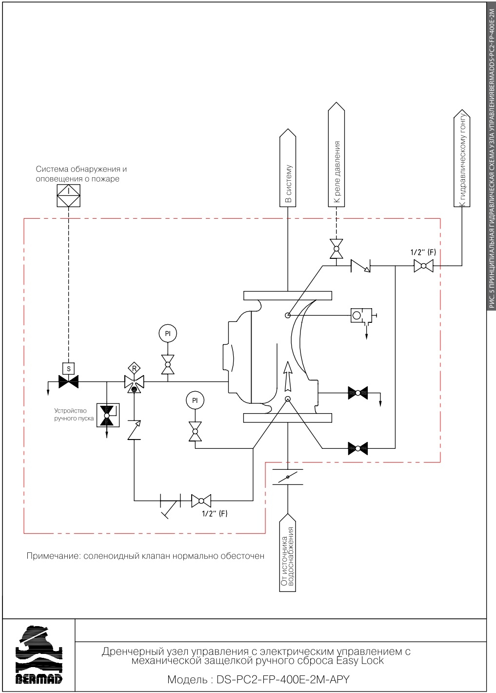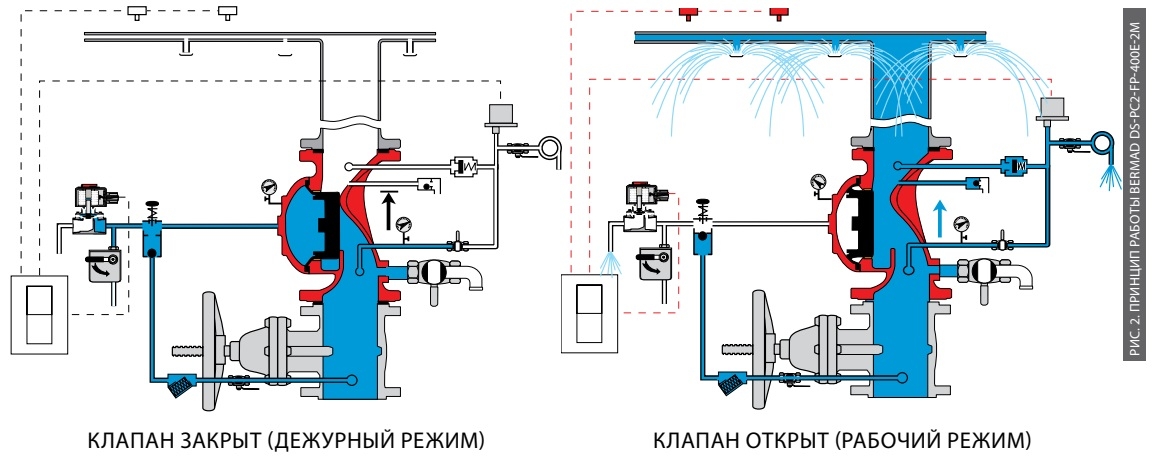 Узел управления Bermad модели PC2-FP-400E-2М применяется в системах, в которых при обнаружении пожара формируется управляющий электрический сигнал и существует сеть распределительных трубопроводов с различным количеством дренчерных