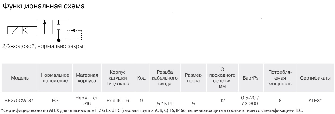 Этот соленоидный клапан сертифицирован в ATEX для опасных зон II 2 G Ex d d IIC T6. Классификация зон для зоны 1 или зоны 2 в соответствии с директивой ATEX 94/9 / EC. Он имеет пыле-влагозащиту IP 66, конструкцию, рассчитанную на непрерывный режим работы, в стандартную комплектацию входит изоляция катушки по классу H и защитный диод (супрессор). Корпус выполнен во взрывозащищенном исполнении Ex d и оснащен встроенной алюминиевой клеммной коробкой с эпоксидным покрытием, включая винтовые клеммы, с кабельным вводом с резьбой ½ " NPT.