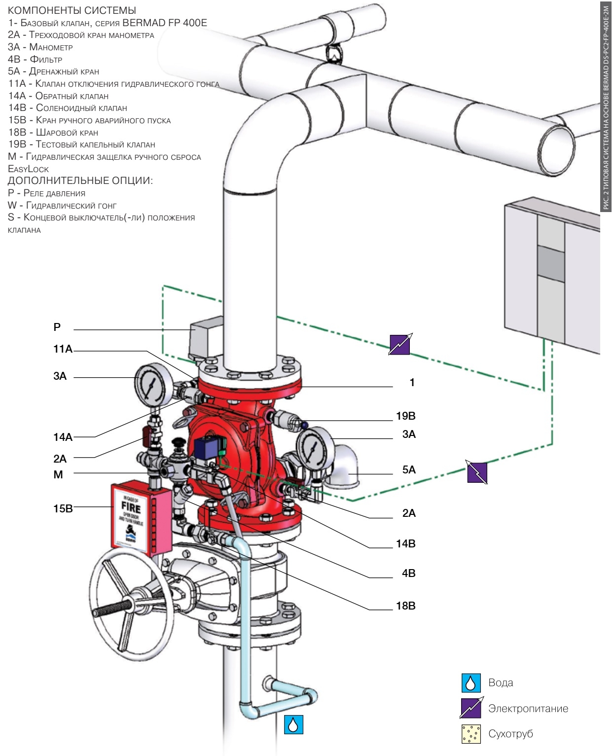 Дренчерный узел управления BERMAD PC2-FP-400E-2M (обозначение по ГОСТ Р 51052-2002: УУ-Д 40-300/2,8(Э12,24,220)В-УФ(М,Х).В4-"400E-2M"), является запорным узлом на базе клапана типа Globe, с электрическим пуском и ручным сбросом, с эластомерной литой мембраной.