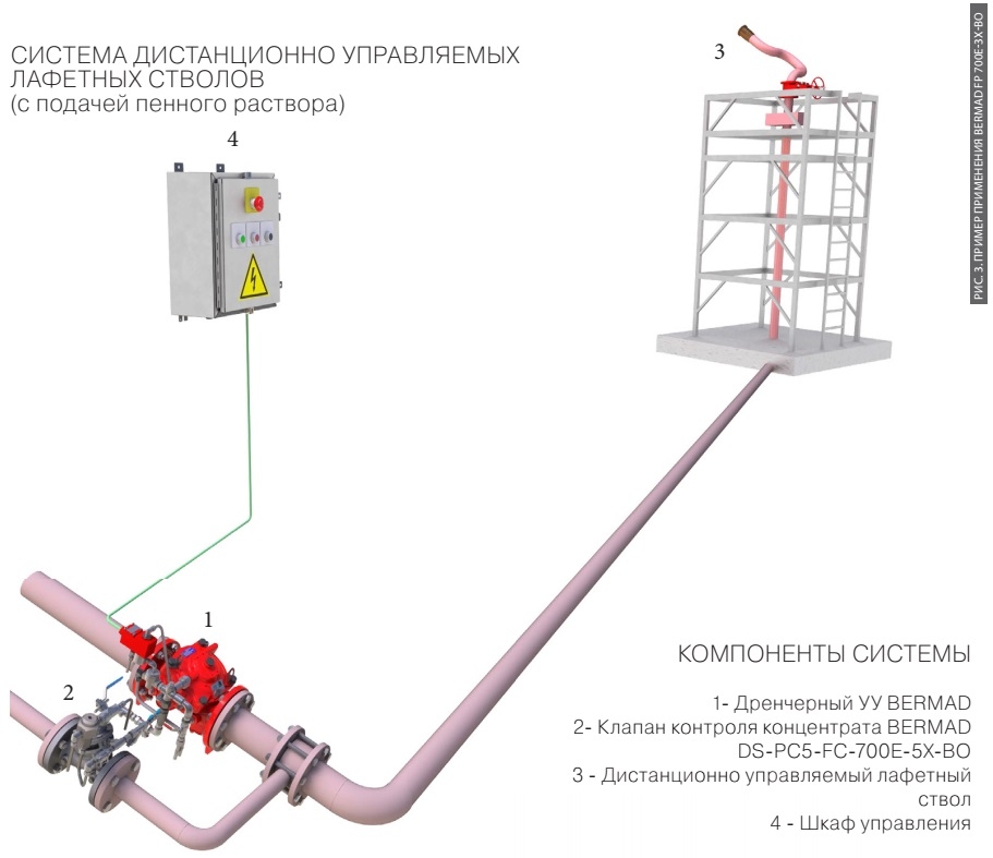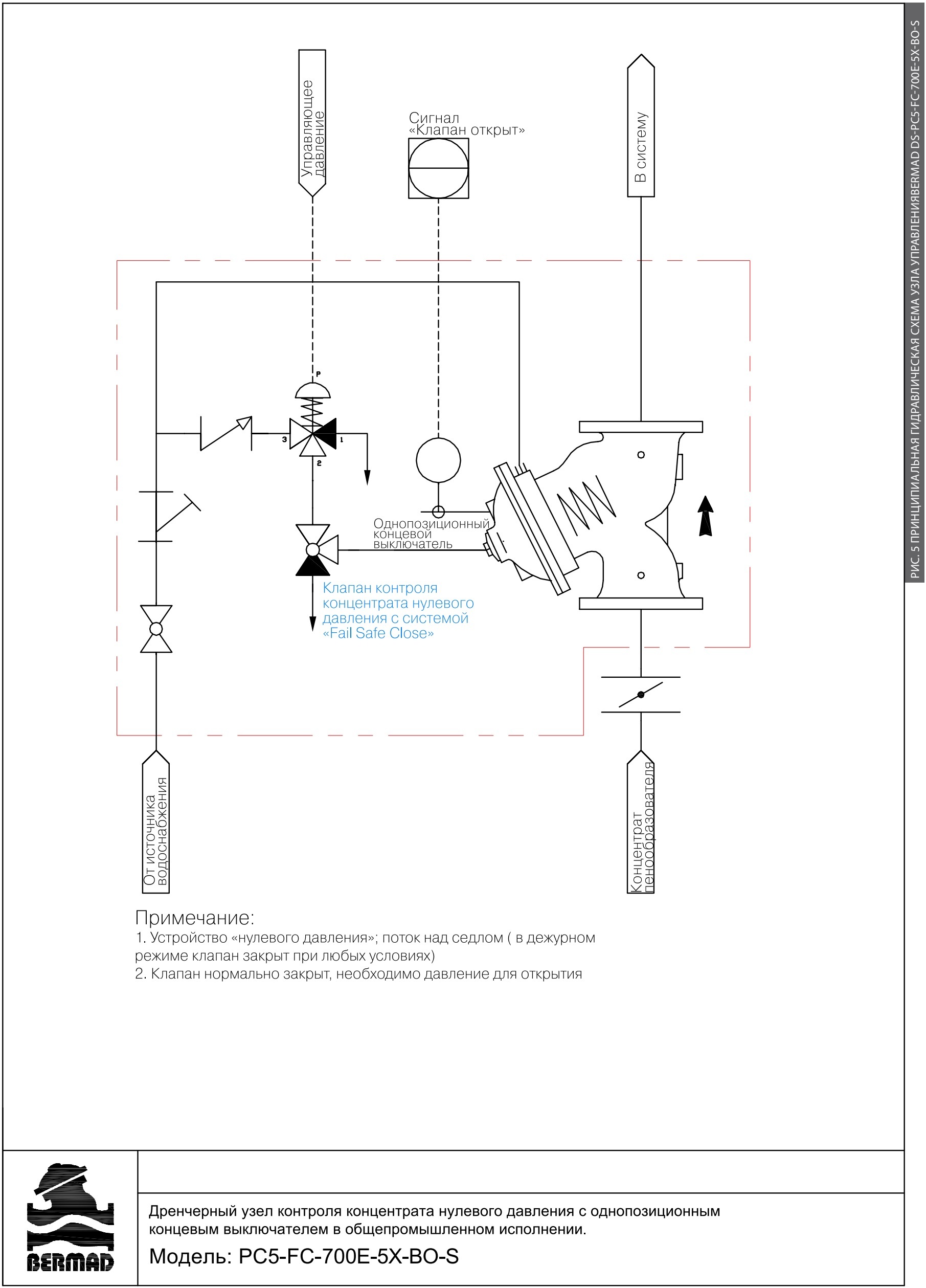Гидравлически управляемый, «нулевого давления» клапан контроля концентрата пенообразователя. Дренчерный узел BERMAD PC5-FC-700E-5XBO (обозначение по ГОСТ Р 51052-2002: УУ-Д(40-100)/2,8(Г0,07)В-УФ(М,Х).В4 -"700") представляет собой двухкамерный клапан контроля пенного концентрата пенообразователя с гидравлическим приводом, управляемый 3-ходовым гидравлическим реле.