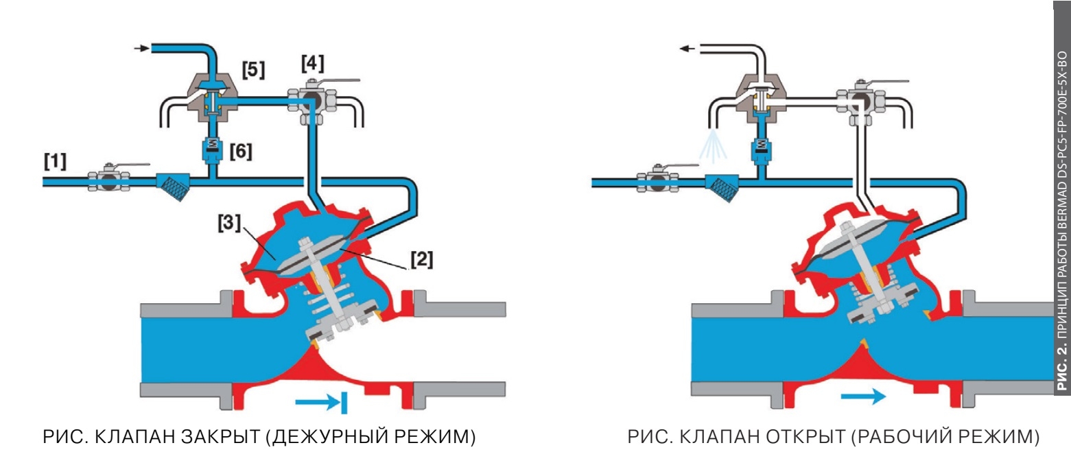 Обратный клапан [6] поддерживает давление в верхней камере управления базового клапана, обеспечивая его полную герметичность до момента срабатывания.