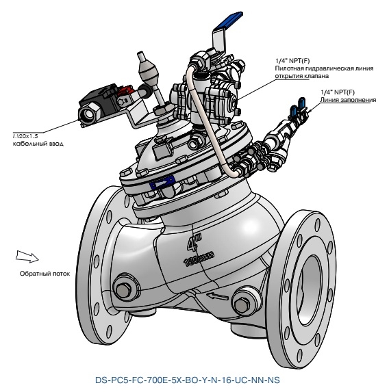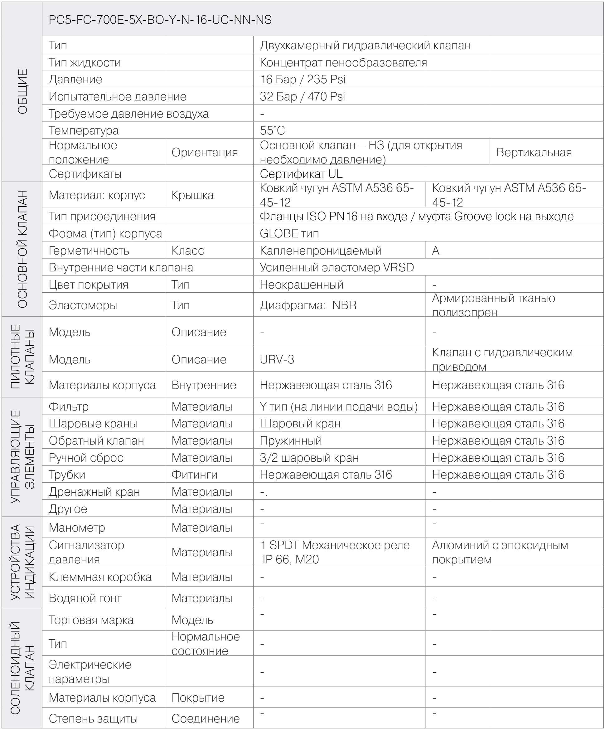 Дренчерный узел управления BERMAD PC5-FC-700E-5X-ВО имеет корпус Y-типа, систему Fail Safe Close, является двухкамерным клапаном, с гидравлическим приводом диафрагмы. Требуется наличия давления в напорном пожарном трубопроводе для его активации.