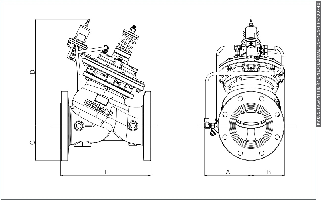- Узел управления BERMAD PC9-FP-730-48 базе мембранного базового клапана серии 700E с угловым корпусом или корпусом Y-типа.