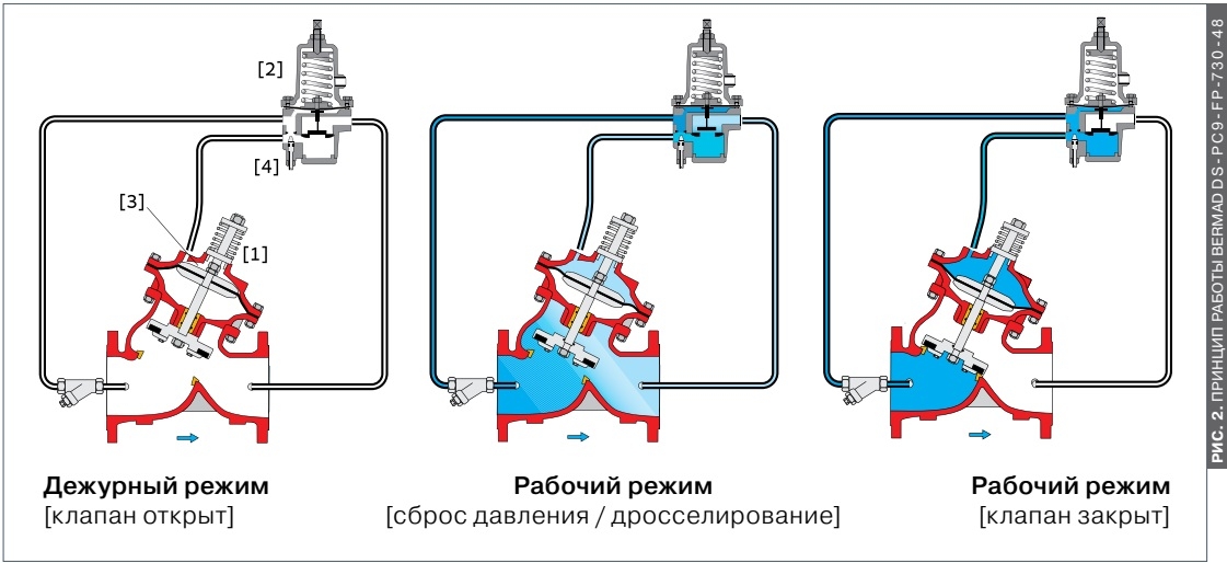 Рабочий режим [сброс давления / дросселирование]. После сброса воздуха, стартового всплеска давления и достижения давлением рабочего значения узел управления BERMAD PC9-FP-730-48 продолжает работу в качестве узла сброса давления (регулятордавления «до себя»). В этом режиме базовый клапан управляется пилотным клапаном сброса давления [2], который имеет преднастройку на значение рабочего давления системы, при превышении которого пилотный клапан открывает базовый, стравливая давление из его верхней камеры управления [3]. Рабочий режим [клапан закрыт]. Когда давление в системе падает ниже предуставновленного пилотом рабочего значения, пилотный клапан аккумулирует давление в верхней камере управления [2] базового клапана, закрывая его. При этом скорость закрытия возможно отрегулировать встроенным в пилот угольчатым клапаном.