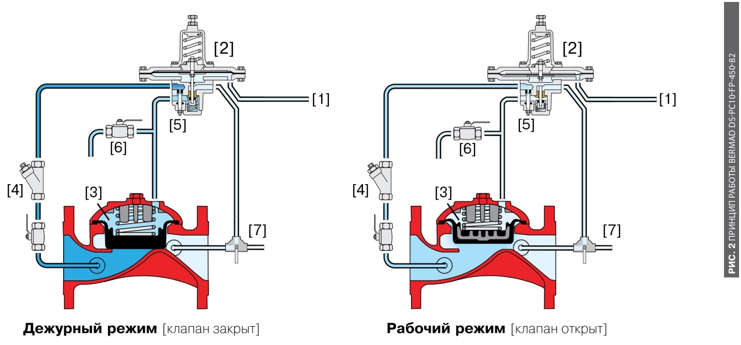 В случае если статическое давление опускается ниже настроек управляющего клапана, пилотный клапан откроется, сбрасывая давление с верхней рабочей камеры базового клапана, что приводит к открытию клапана и заполнению резервуара.