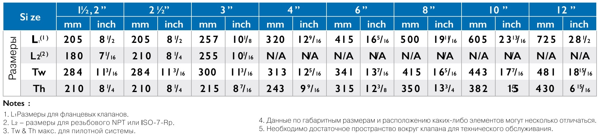 Управление: клапан управляется гидростатическим пилотным клапаном, с закрытой центрированной пружиной и 8-дюймовой (200 мм) чувствительной мембраной, изолирующим шарововым краном, фильтром и игольчатым клапаном с регулируемой скоростью закрытия. Все детали и фиттинги обвязки выполнены из нержавеющей стали 316. Перед отгрузкой клапан проходит гидравлические испытания имитирующие рабочие условия клапана.